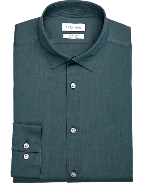 This Calvin Klein non-iron dress shirt is made with Supima domestic long staple cotton fiber. Made for easy care and comfort, this machine-washable and wrinkle-resistant style does not require ironing. All solid colors within this program are made with 100s 2-ply yarn. Complementing the program is a new collar that delivers a refined appearance. The new collar features an updated shape, elevated construction with increased stitches per inch, and built in stays to prevent tip curling. Slim Fit is slim and tapered across the chest, shoulders, armholes, waist and sleeves without compromising on comfort. Recommended for more triangle body types (broad shoulder and chest, narrow waist and hips).