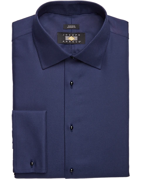 Rendering natural stretch from supreme Egyptian cotton, this Joseph Abboud tuxedo formal shirt is woven into a trim, Modern Fit with a smooth French placket along with French cuffs for the ultimate finishing touch. The non-iron treatment defies wrinkles for a crisp, flawless look. Modern Fit is close-fitting without being constricting through the chest, body, and sleeve. Recommended for more rectangular body types (shoulders aligned with hips, with the waist slightly smaller).