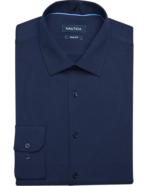 - Wrinkle resistant|Polyester blend|Spread collar|No pockets|Four-way stretch|Slim Fit|Nautica|