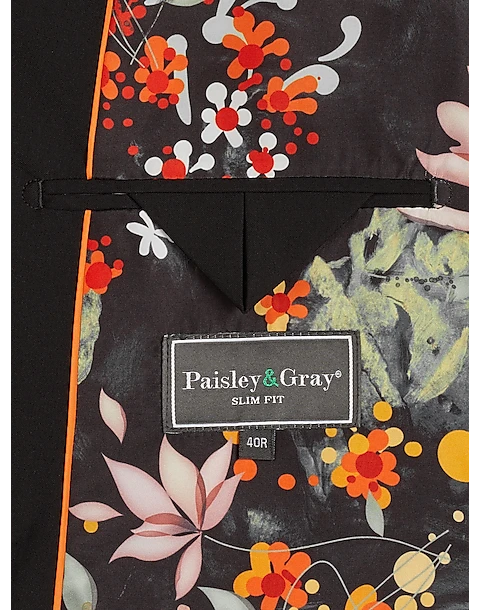 - 74% polyester 24% rayon 2% spandex|Double breasted|Peak lapel|Side vents|Coordinating pieces sold separately|Matching Pant: TMW_3XKC_3XKD_02|Slim Fit|Paisley & Gray|