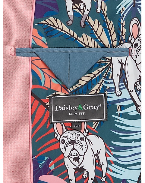 - 64% polyester 34% rayon 2% spandex|Two button|Peak lapel|Side vents|Ticket pocket|Coordinating pieces sold separately|Slim Fit|Paisley & Gray|